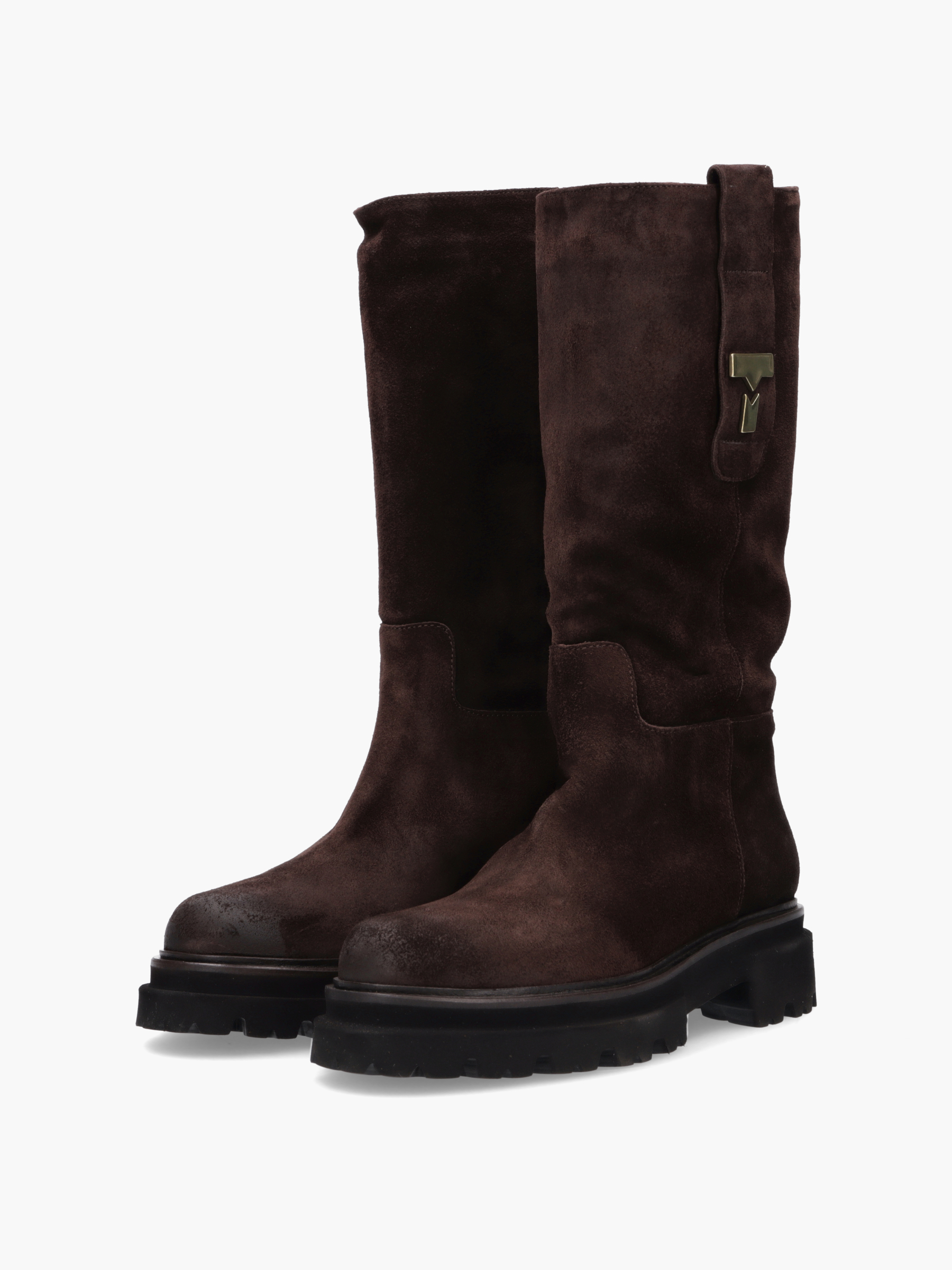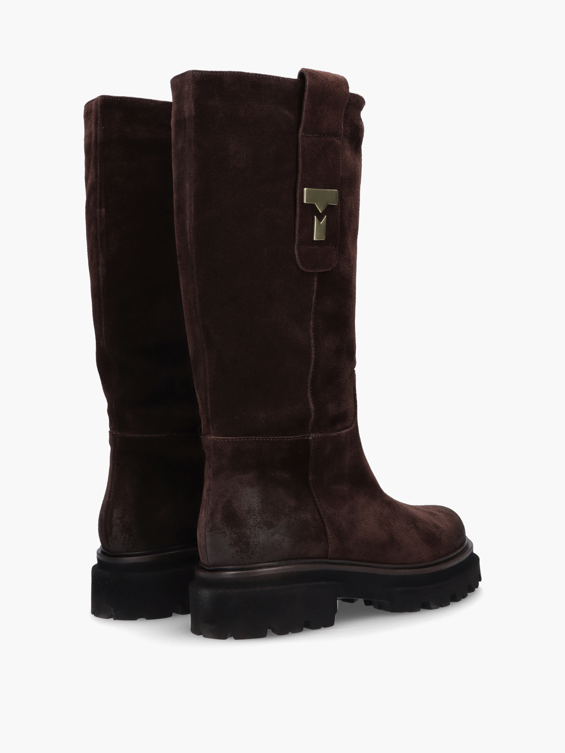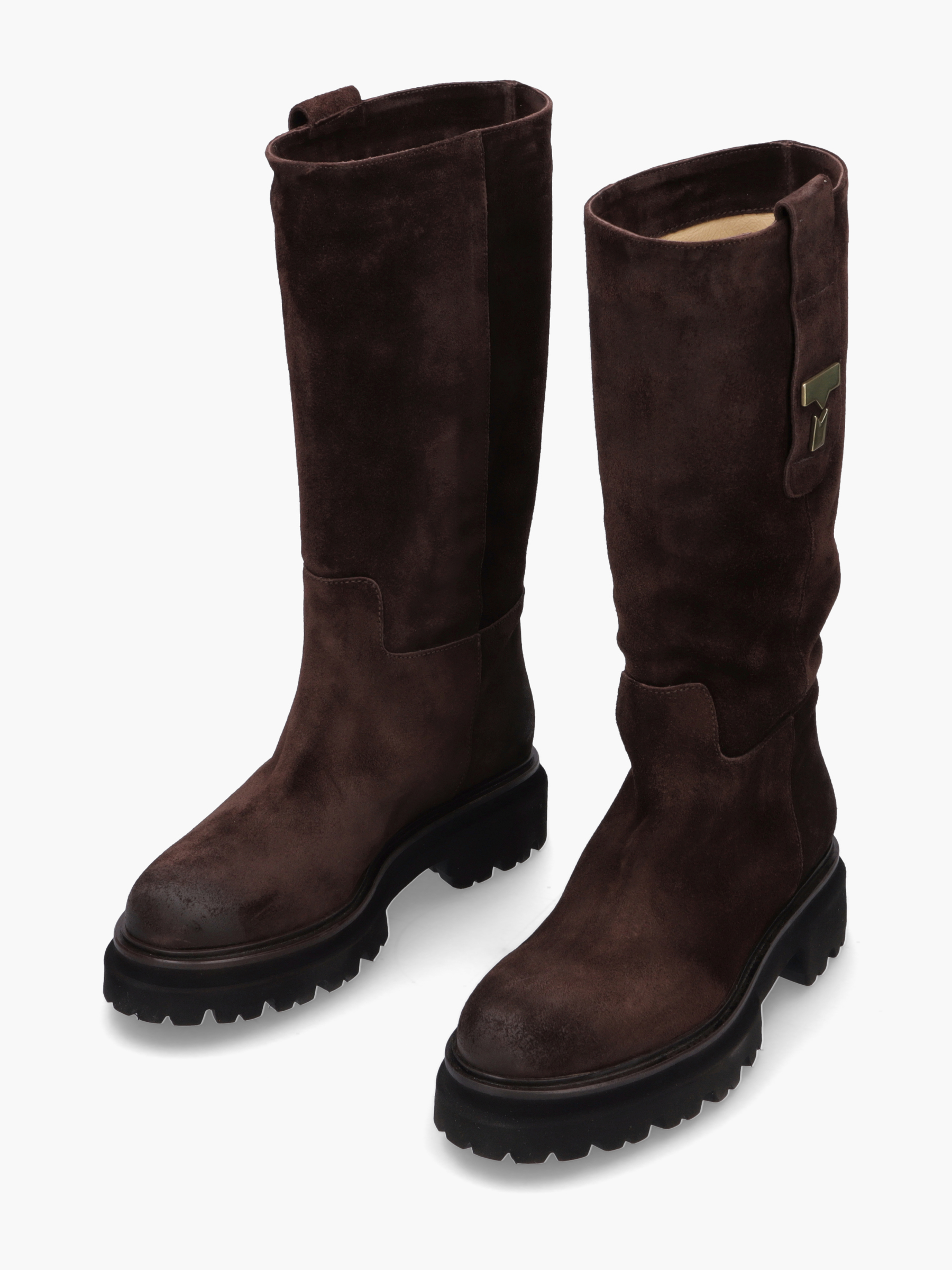 The CELIA boots combine a robust design with a touch of extravagance. Made from high-quality suede and featuring an eye-catching metal logo appliqué, they make a striking statement. The chunky treaded sole ensures stability and gives the look a strong presence.