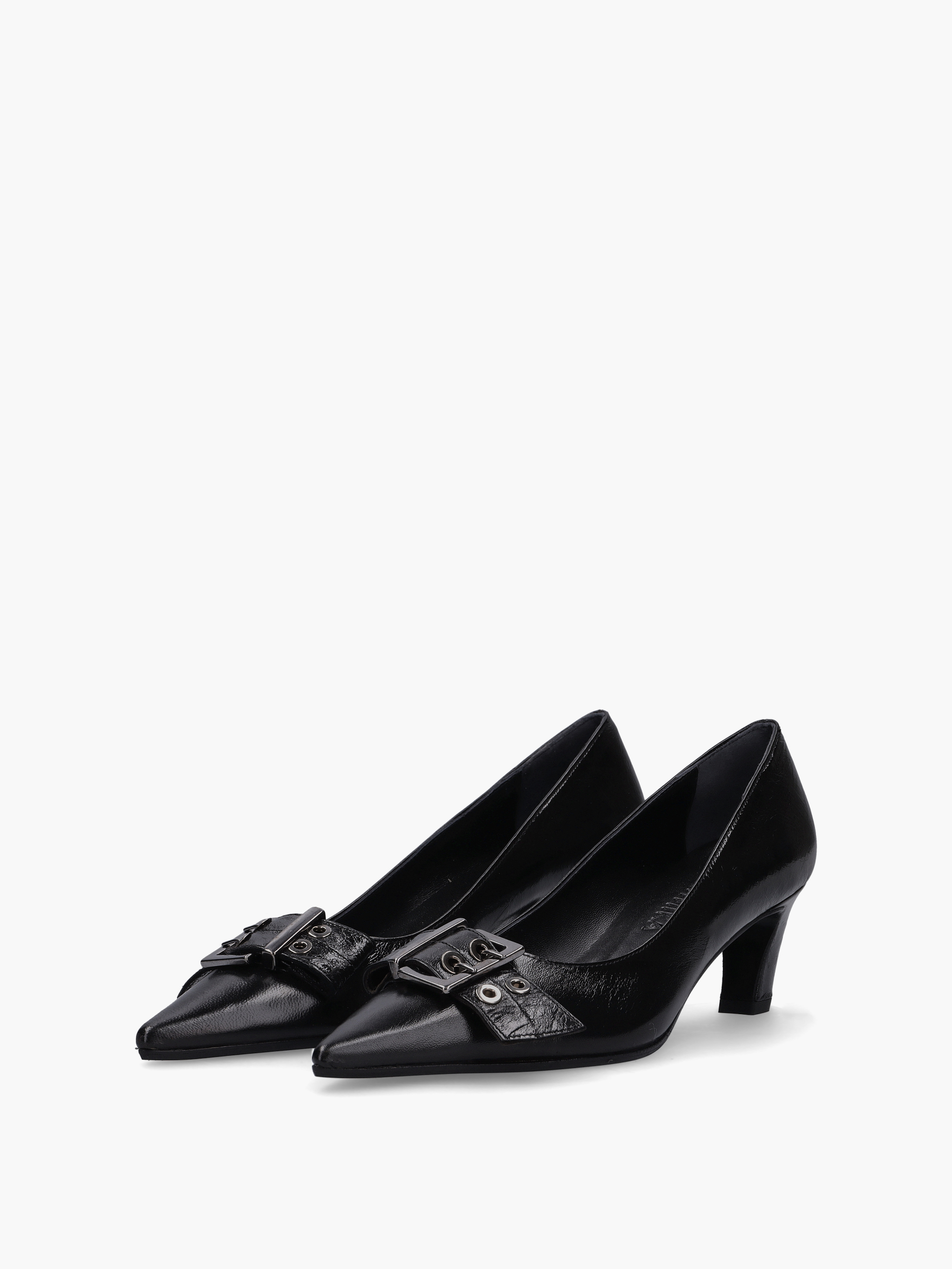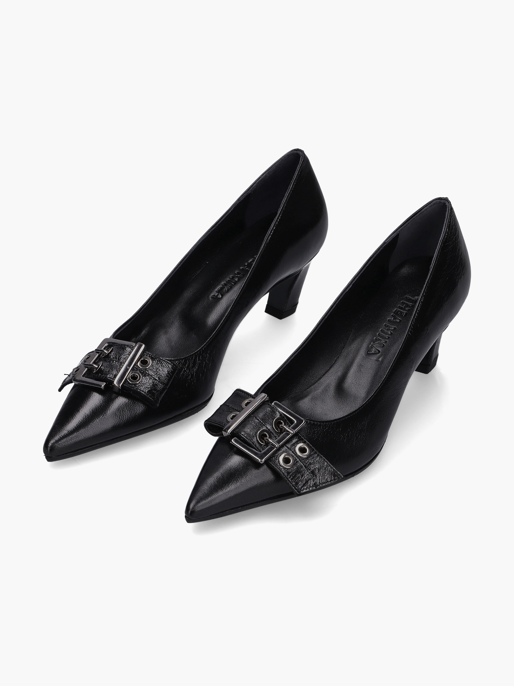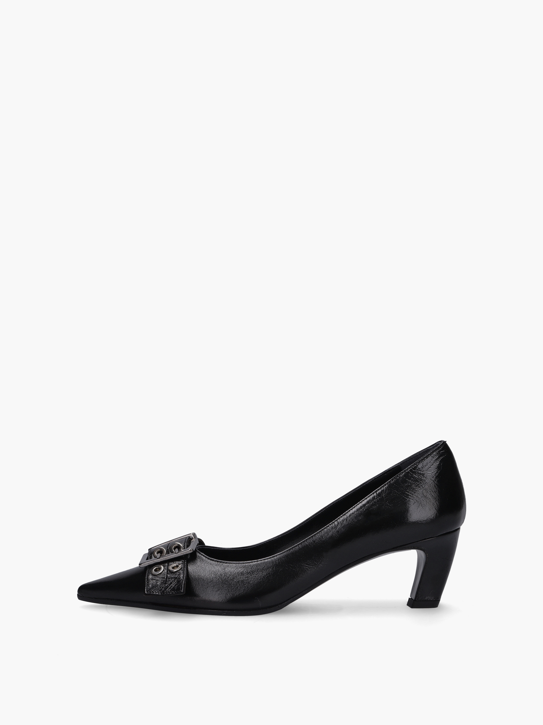This pointed-toe court shoe made from high-quality smooth leather attracts everyone's attention with its eye-catching decorative buckle. The mid-height heel offers a secure stance and an elegant line - for stylish days and special evenings. VAJANA combines classic chic with a striking presence and will be the style-defining highlight of your outfit. Handmade in Italy with great attention to detail. Style tip: Use VAJANA as a contrast to minimalist looks - for example, with wide-cut Marlene trousers or a clean sheath dress.