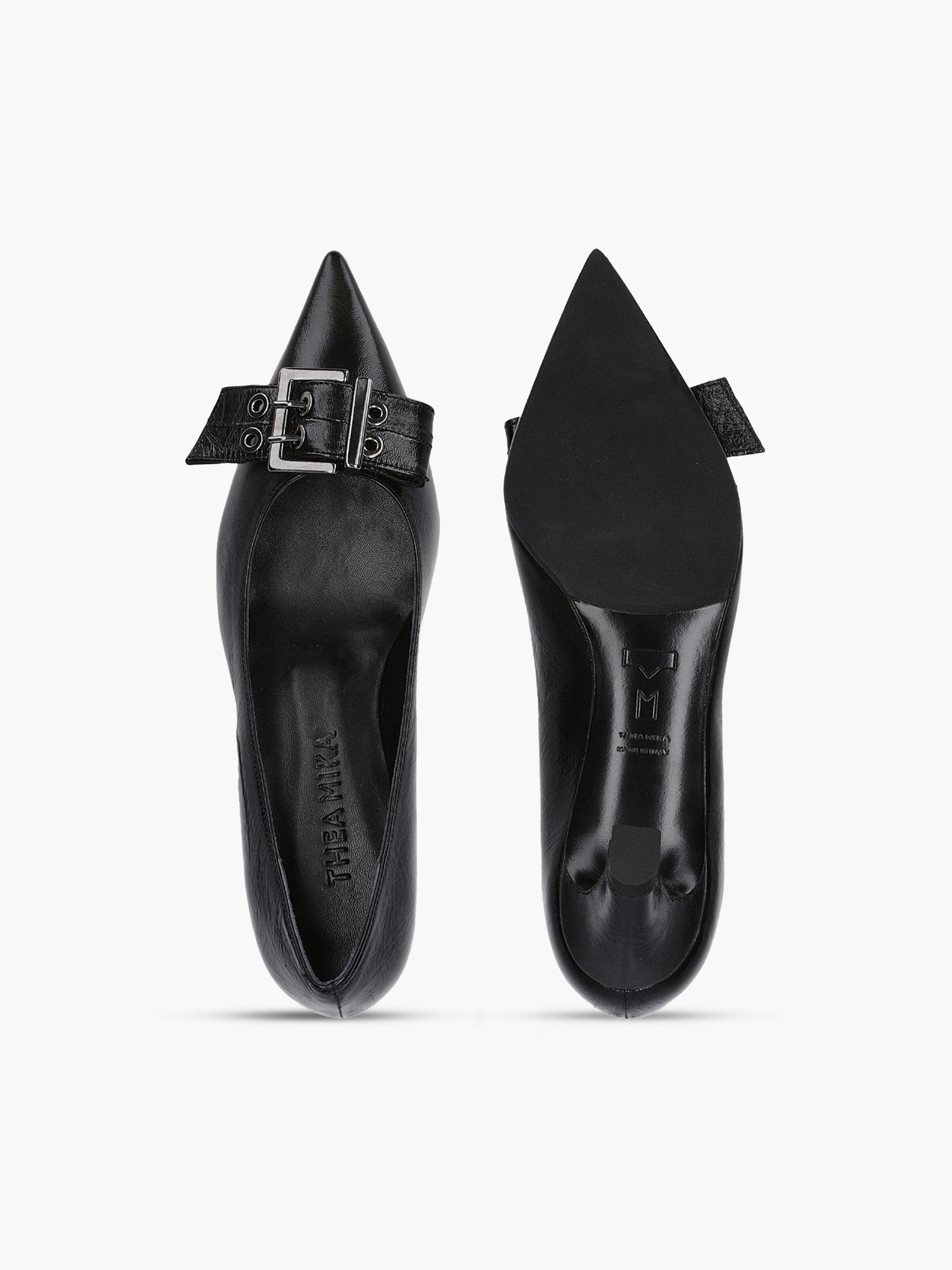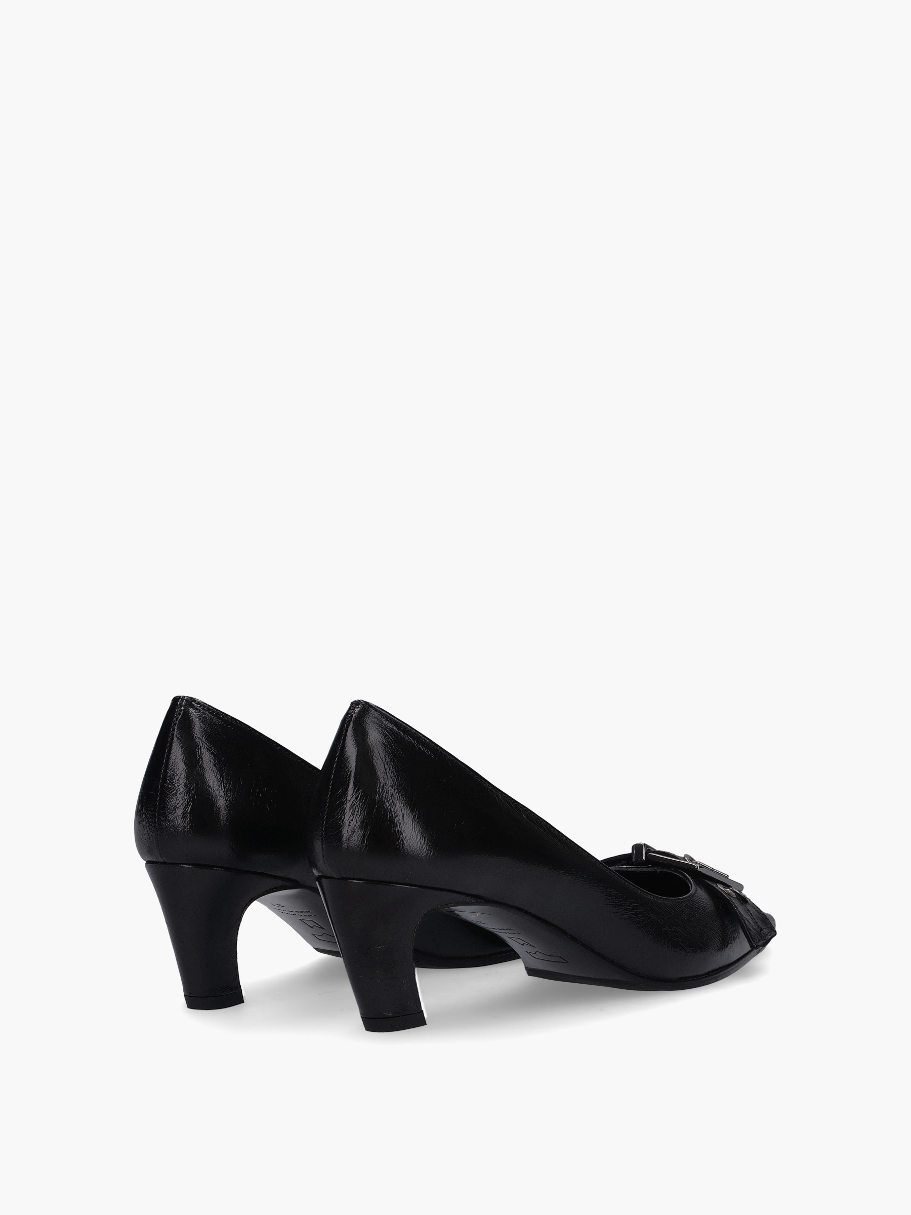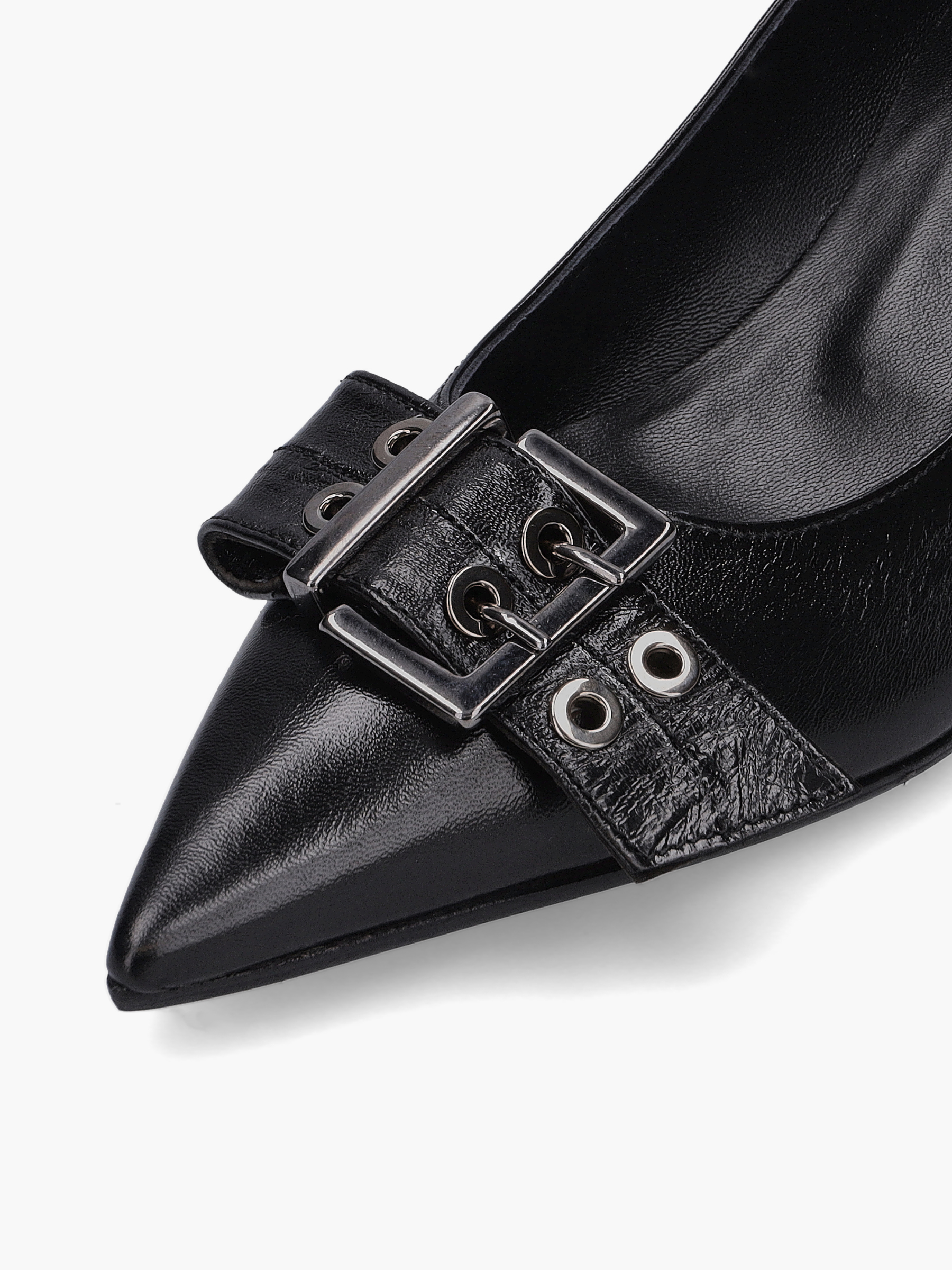 This pointed-toe court shoe made from high-quality smooth leather attracts everyone's attention with its eye-catching decorative buckle. The mid-height heel offers a secure stance and an elegant line - for stylish days and special evenings. VAJANA combines classic chic with a striking presence and will be the style-defining highlight of your outfit. Handmade in Italy with great attention to detail. Style tip: Use VAJANA as a contrast to minimalist looks - for example, with wide-cut Marlene trousers or a clean sheath dress.