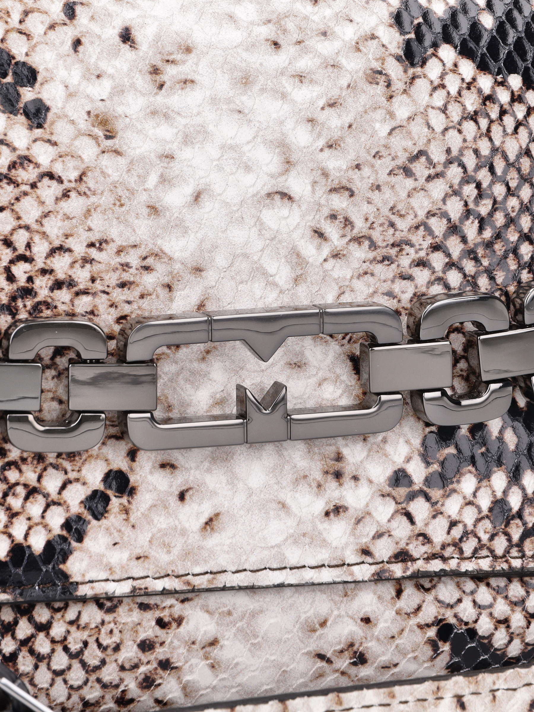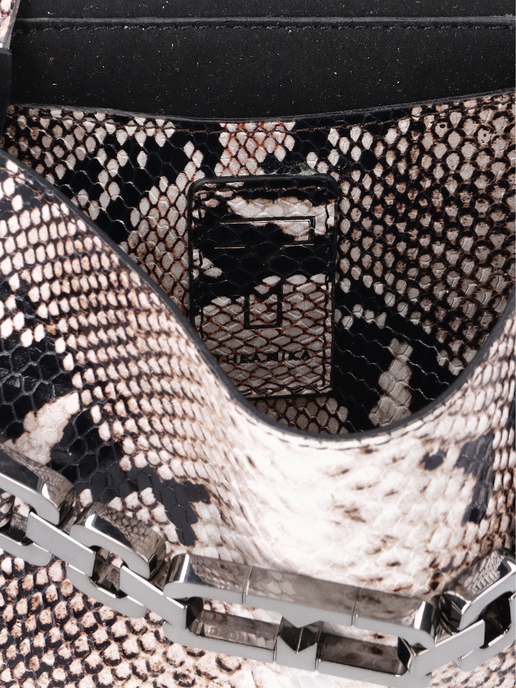 This clutch in a contemporary snake-print design is a true statement piece that adds a luxurious touch to any outfit. Its compact silhouette offers just the right amount of space for your essentials, making it the perfect companion for evening events or special occasions. With its refined pattern and sleek lines, it combines elegance and modern style in one accessory.