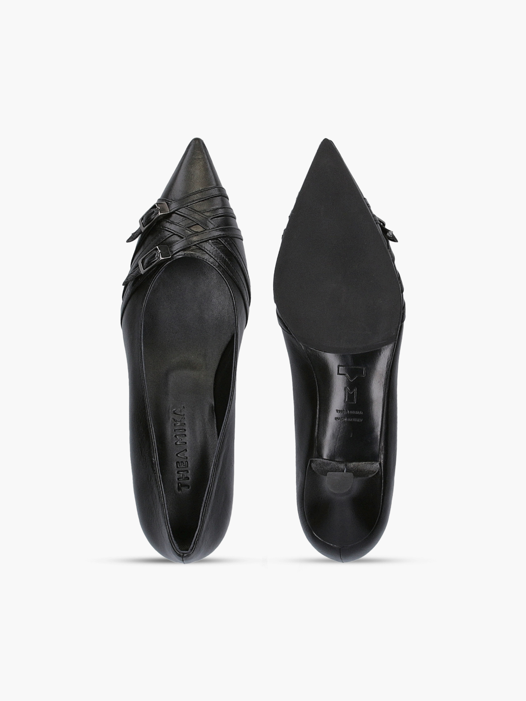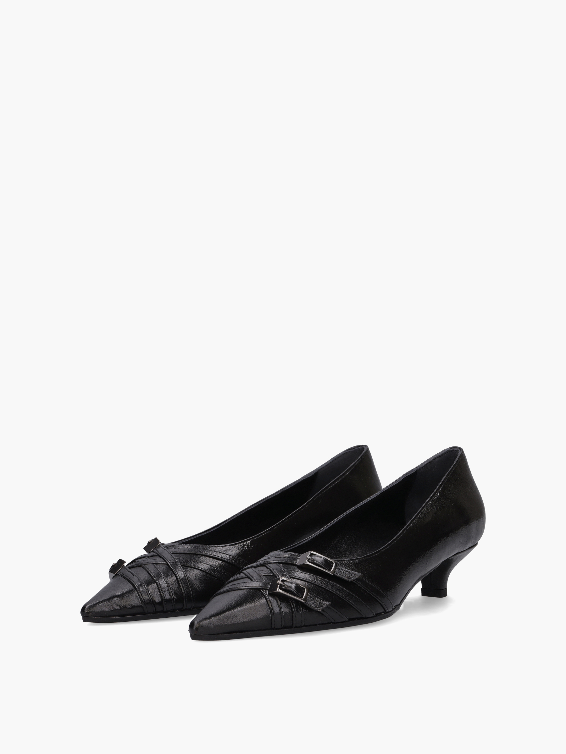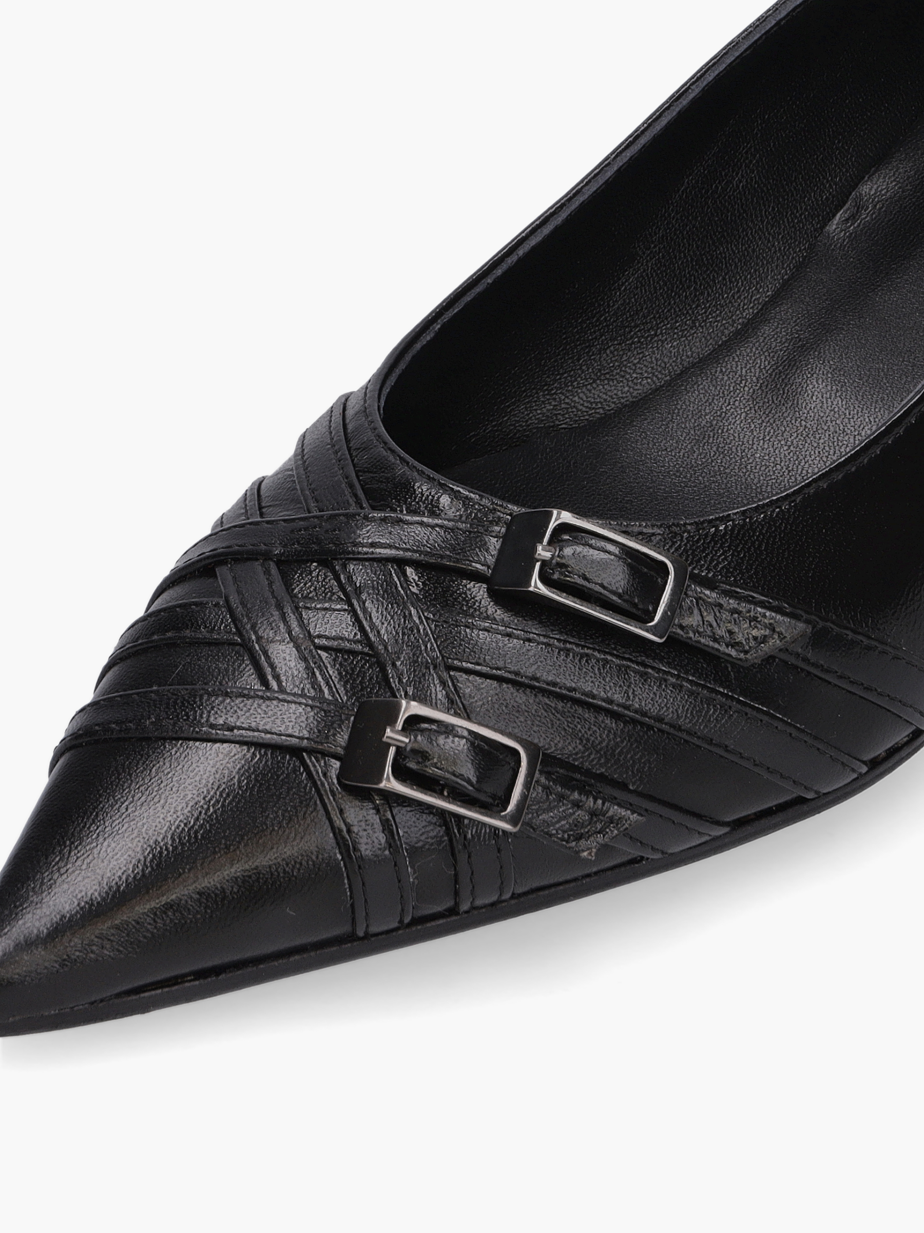 These pumps made from elegant smooth leather impress with their slim silhouette, pointed cut and two striking decorative buckles. The low heel height provides comfort without sacrificing style - perfect for long days with a fashionable effect. VAIDA skilfully plays with classic femininity and modern strength. Handmade in Italy, for women who love details and show attitude.
